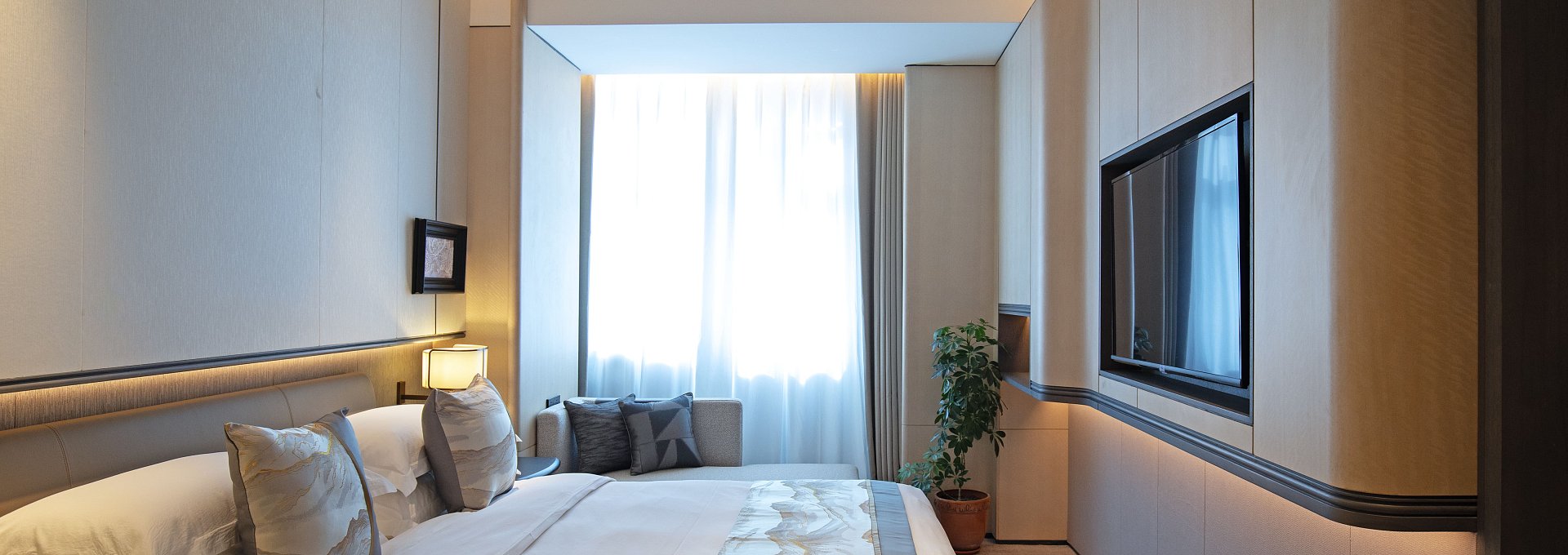 Двухкомнатный люкс категории Business Suite расположен на верхних этажах и отличается панорамными видами на город. Современный дизайн и высокий уровень комфорта делают его идеальным выбором для деловых поездок и длительного проживания. В номере представлена кровать king-size, с гипоаллергенным постельным бельем, зона отдыха с мягкой мебелью, уголок с письменным столом, высокоскоростным Wi-Fi и комфортным освещением для работы. С окон открывается панорамный вид на город.